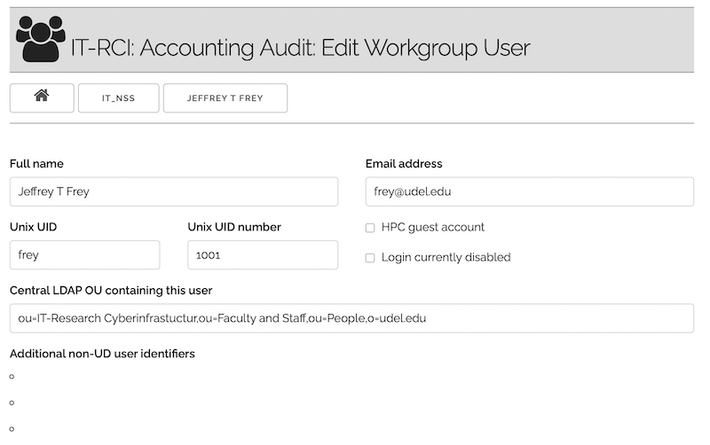 All accounts have at least one workgroup sponsor on the system(s) so, under an account audit, administrative contacts for the workgroups must indicate the ongoing status of every extant account previously approved. To collect these dispositions, a web portal has been created to be used by workgroups' administrative contacts. The portal presents and queries only the pertinent information: the format is (hopefully!) intuitive and self-guiding.